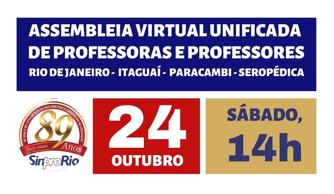 As professoras e os professores, filiados/as ou não ao Sinpro-Rio, estão convocados/as para participar da ASSEMBLEIA VIRTUAL UNIFICADA, dia 24/10, sábado, às 14 horas, pelo aplicativo ‘Zoom’.