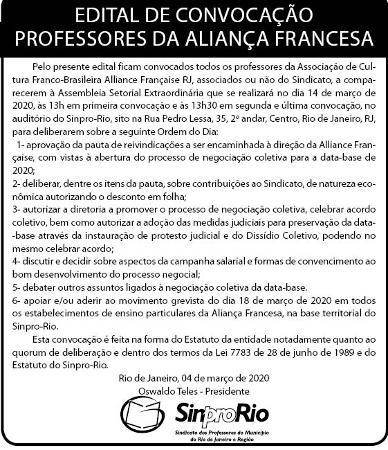 Aliança Francesa: assembleia dia 14/03, às 13h, no Sinpro-Rio