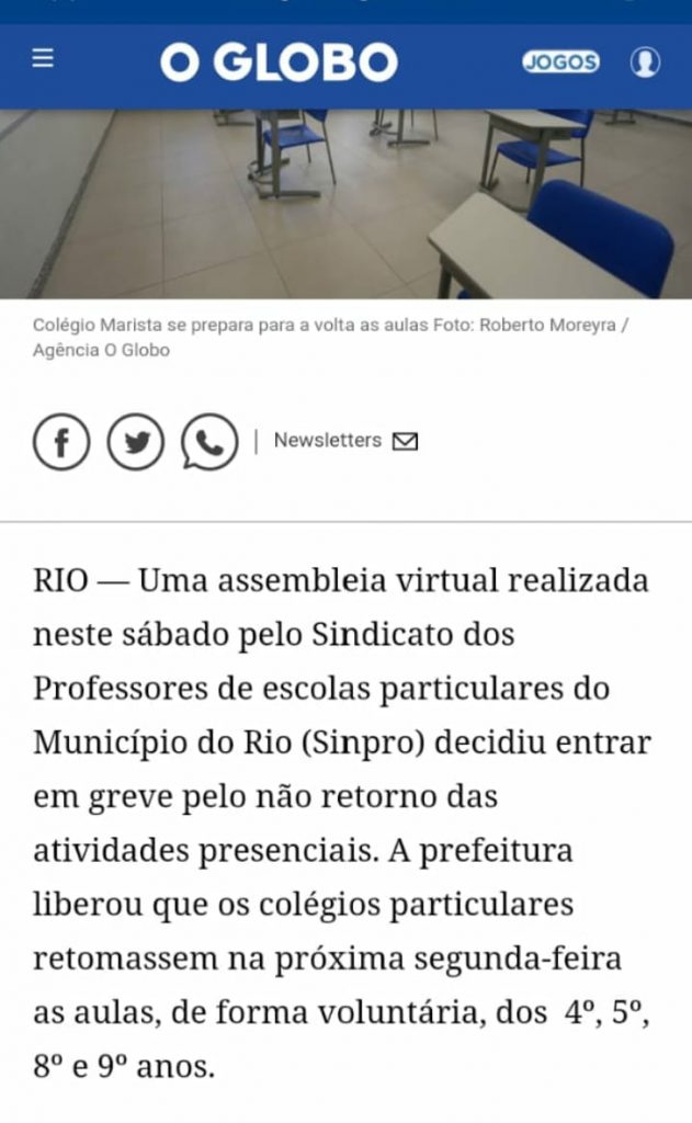 ?JORNAL O GLOBO – ENTREVISTA COM O VICE-PRESIDENTE DO SINPRO-RIO: Tão logo terminou a assembleia, o vice-presidente do Sinpro-Rio, professor Afonso Celso Teixeira, foi procurado pelo jornal O Globo para falar sobre a greve pela vida. A matéria, no entanto, é apenas para assinantes de O Globo (regras estipuladas por este jornal). De toda forma, segue o link para aqueles que são assinantes AQUI, e colocamos apenas uma imagem da notícia abaixo: