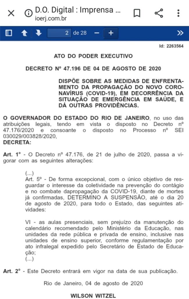 ? 05/08/2020 – DIÁRIO OFICIAL DO ESTADO DO RIO DE JANEIRO – IOERJ: “DECRETO ESTADUAL SUSPENDE AULAS PRESENCIAIS NAS REDES PÚBLICA E PRIVADA, EM TODO O ESTADO, ATÉ 20/08/2020”: