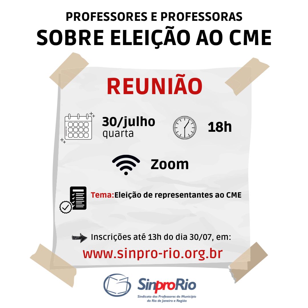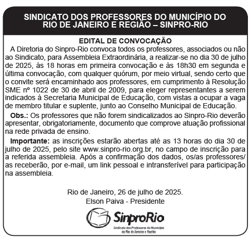 Professores, foi publicado o edital dia 26/07/2025, na página 06 do jornal Monitor Mercantil, convocando para a assembleia no dia 30 de julho, às 18h. Será necessário fazer a inscrição prévia.