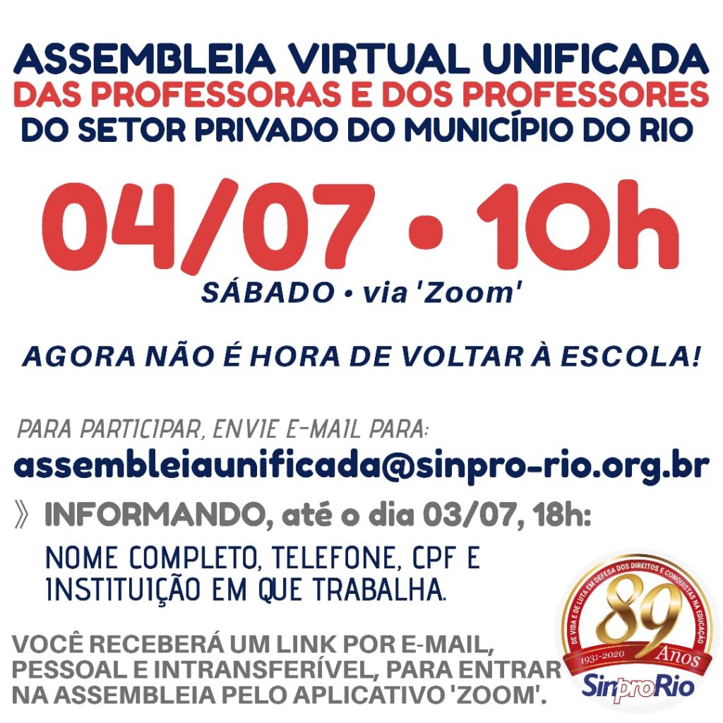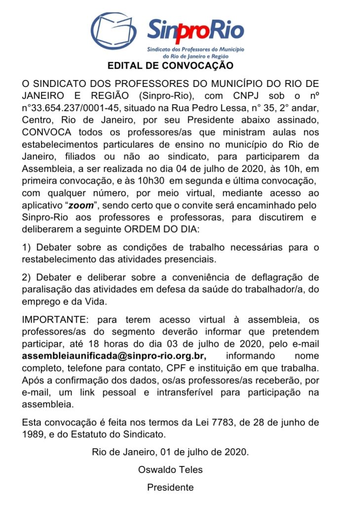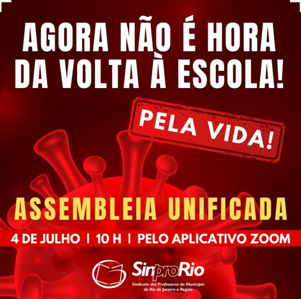 Após não haver acordo sobre a data para o retorno às aulas presenciais dentro das escolas (leia a matéria AQUI), o Sinpro-Rio convocou assembleia para o dia 04 de julho, sábado, às 10 horas, pelo aplicativo ‘Zoom’. A assembleia é para todos os professores e todas as professoras da Educação Infantil à Educação Superior, do setor privado do município do Rio de Janeiro, filiados/as ou não ao sindicato, que se inscreverem até as 18 horas do dia 03 de julho, pelo e-mail criado especificamente para essa assembleia.
