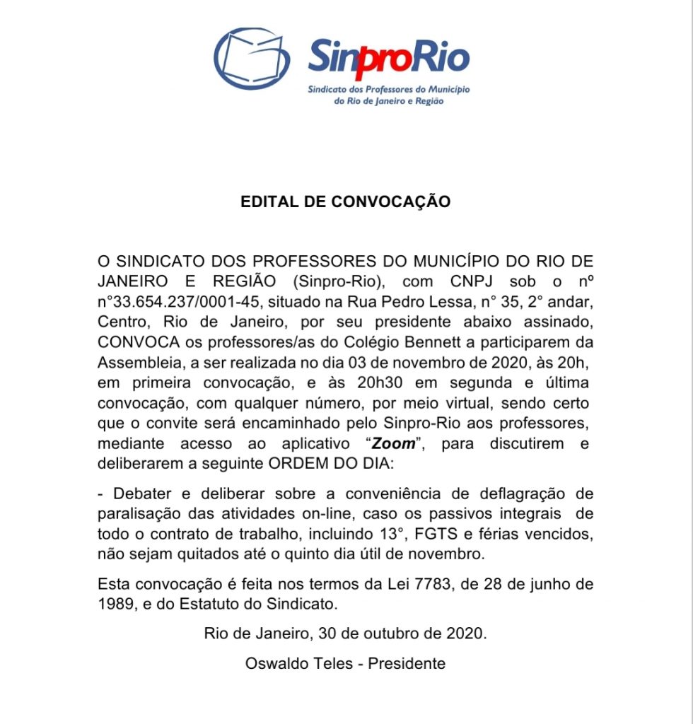 Bennett: assembleia virtual dia 03/11, às 20h!