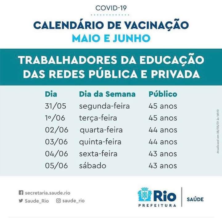- CALENDÁRIO ANTERIOR: docentes de 45 a 43 anos, divulgado pela Prefeitura do Rio: