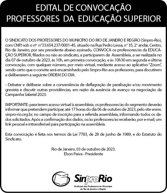 Nessa terça-feira, dia 03/10/2023, publicamos edital na página 6 do jornal Monitor Mercantil, convocando esta assembleia, onde você pode ler a pauta (veja a página do jornal aqui)! Não é necessário ser filiado/a ao sindicato para participar, basta se inscrever previamente, pelo botão abaixo: