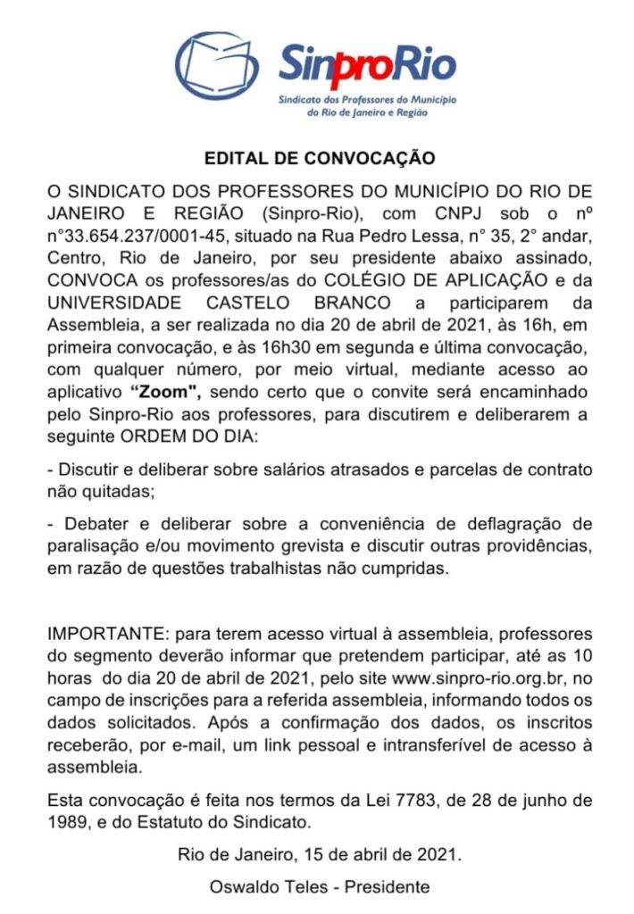 Colégio de Aplicação e Faculdade Castelo Branco: assembleia 20/04, às 16h