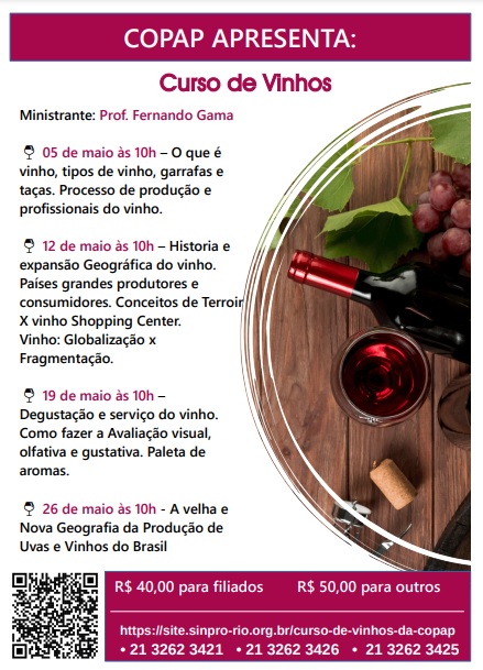 No dia 05 de maio, começou o Curso de Vinhos, oferecido pela Copap – Comissão de Professores/as Aposentados/as e Pensionistas, na sede Centro do Sinpro-Rio.
