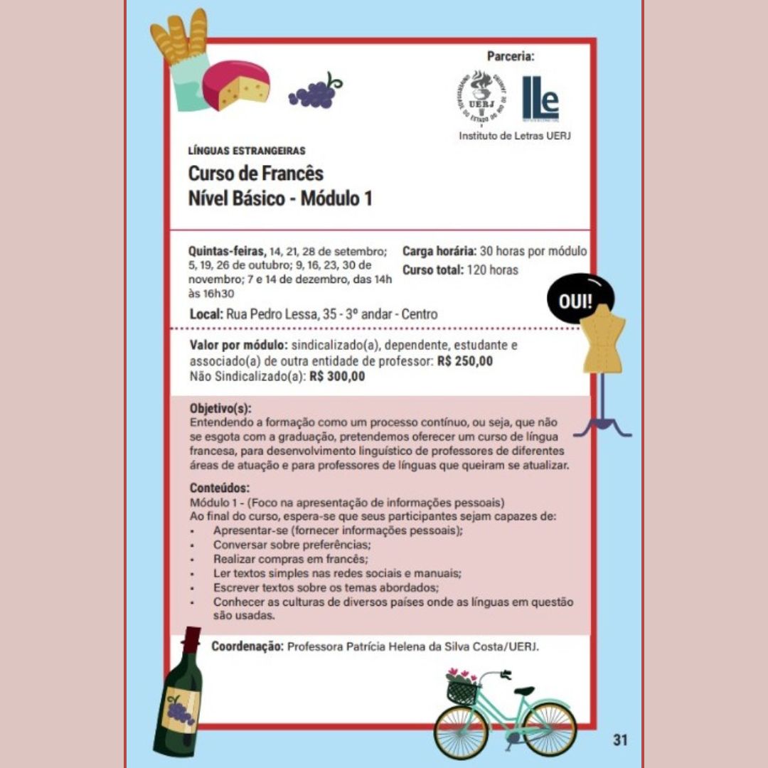 Objetivo(s): Entendendo a formação como um processo contínuo, ou seja, que não se esgota com a graduação, pretendemos oferecer um curso de língua francesa, para desenvolvimento linguístico de professores de diferentes áreas de atuação e para professores de línguas que queiram se atualizar.