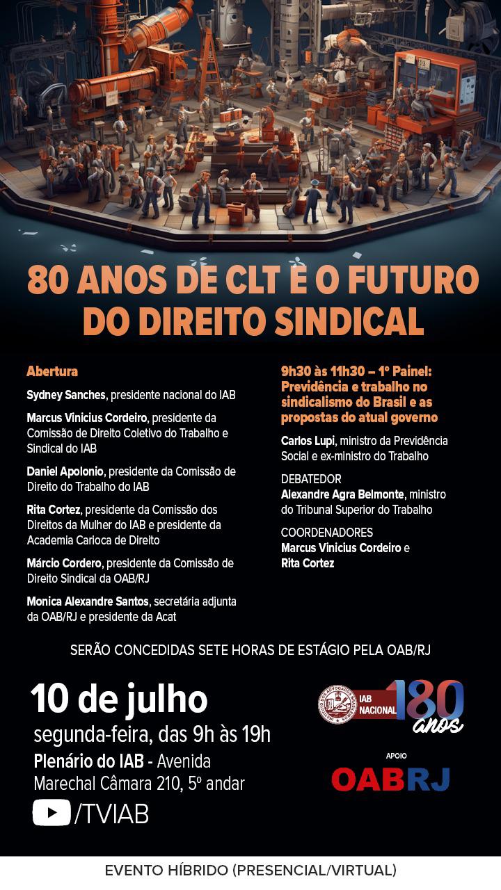 DEBATE: 80 anos de CLT e o futuro do direito sindical; dia 10 de julho