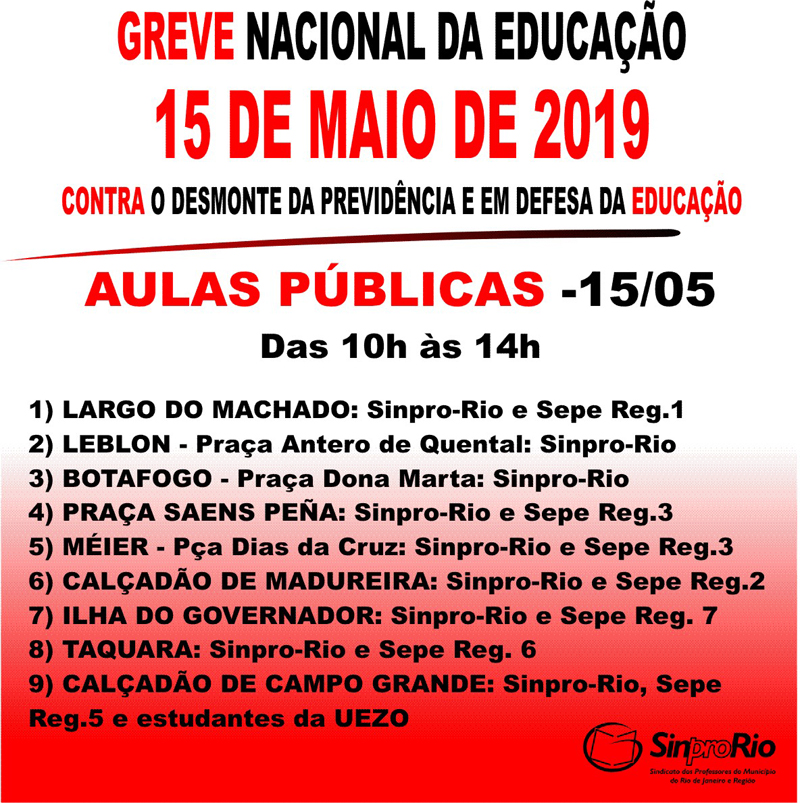 Confira abaixo os locais dos Atos Conjuntos do Sinpro-Rio e Sepe-RJ: