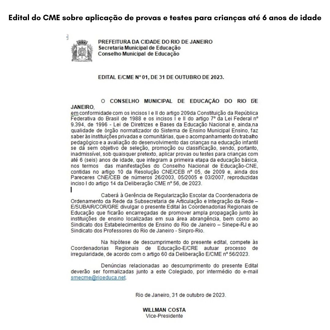 em conformidade com os incisos I e II do artigo 209da Constituição da República Federativa do Brasil de 1988 e os incisos I e II do artigo 7º da Lei Federal nº 9.394, de 1996 – Lei de Diretrizes e Bases da Educação Nacional e, ainda, na qualidade de órgão normatizador do Sistema de Ensino Municipal Ensino, faz saber às instituições privadas e comunitárias, que o acompanhamento do trabalho pedagógico e a avaliação do desenvolvimento das crianças na educação infantil se dá sem objetivo de seleção, promoção ou classificação, sendo, portanto, inadmissível, sob quaisquer pretexto, aplicar provas ou testes para crianças com até 6 (seis) anos de idade, que integram a primeira etapa da educação básica, nos termos das manifestações do Conselho Nacional de Educação-CNE, contidas no artigo 10 da Resolução CNE/CEB nº 05, de 2009 e, ainda dos Pareceres CNE/CEB de números 26/2003, 05/2005 e 03/2007, reproduzidas inciso I do artigo 14 da Deliberação CME nº 56, de 2023.