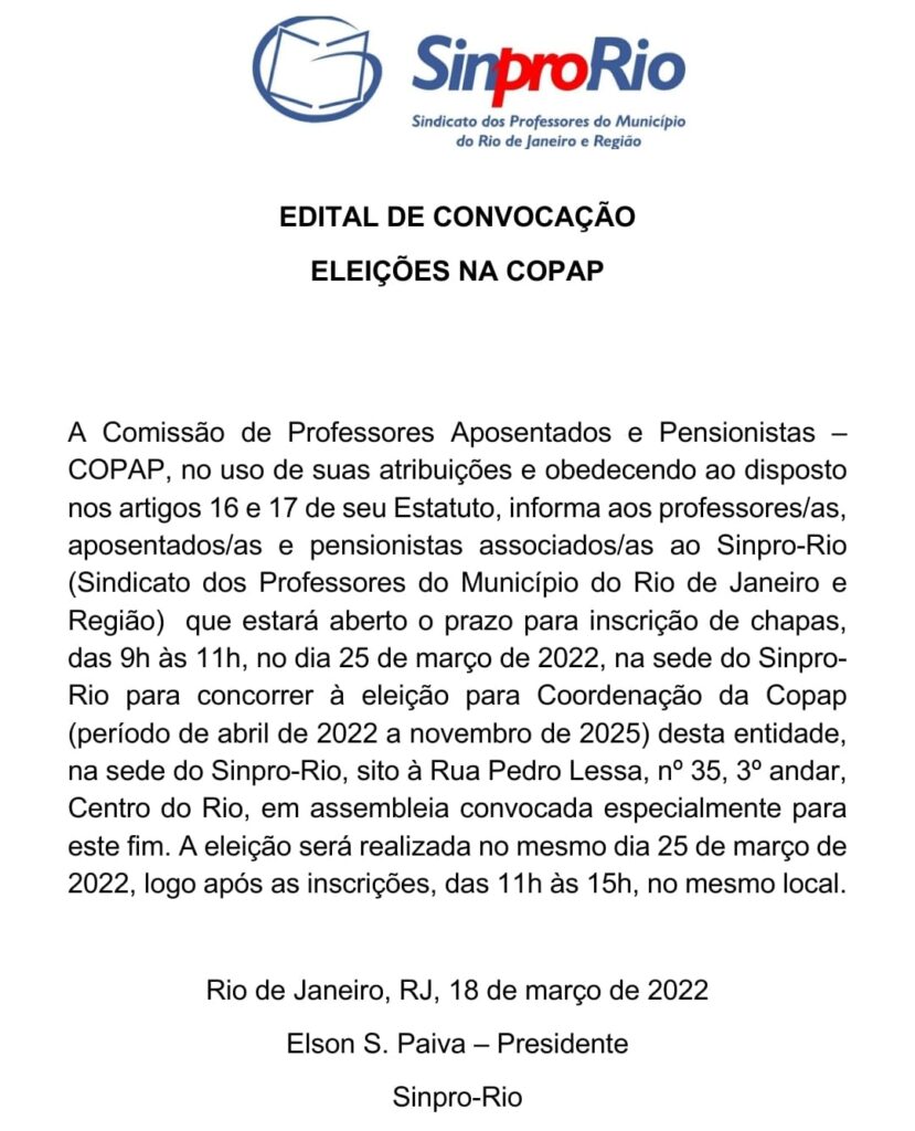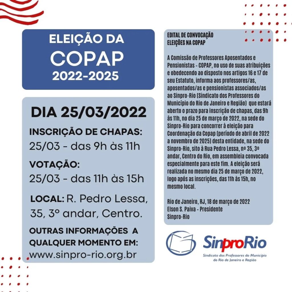 No dia 25 de março, o Sindicato realizará eleições para a Coordenação da Comissão de Professores Aposentados e Pensionistas do Sinpro-Rio (COPAP), na sede Centro da entidade (Rua Pedro Lessa, nº 35, 3º andar, Centro).