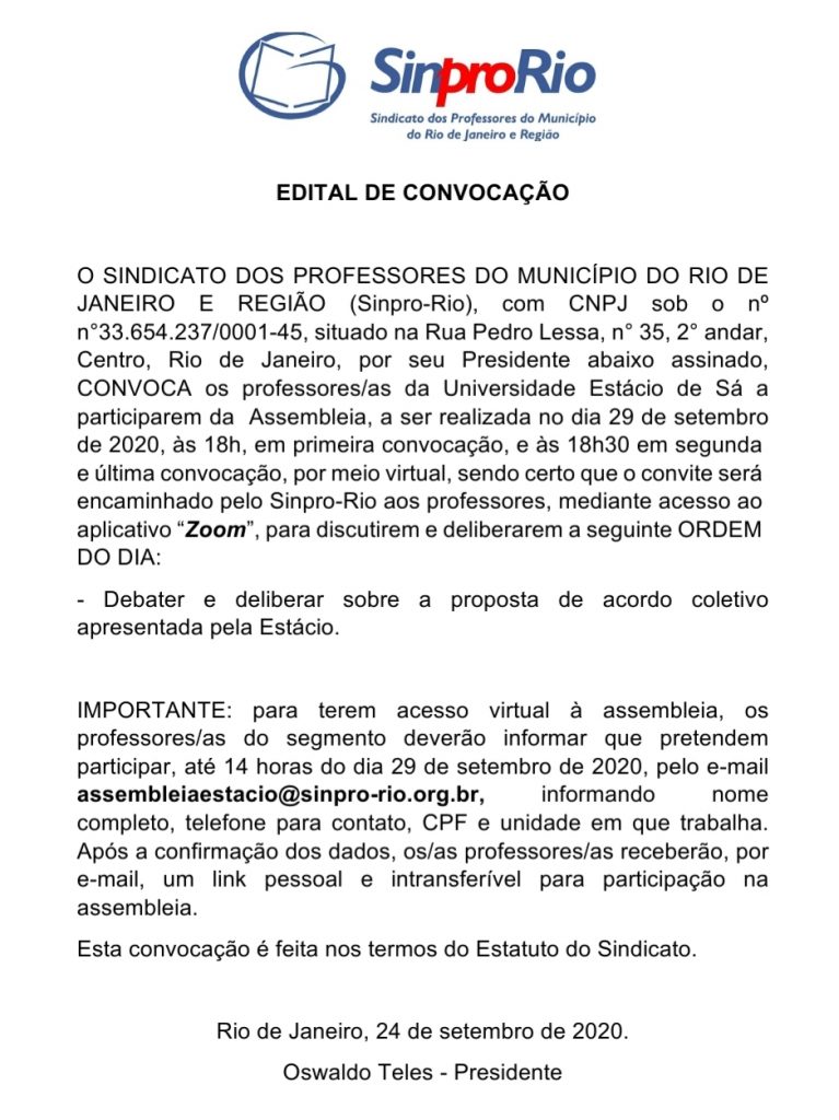 Fique atento/a ao prazo e informações para inscrição. Envie nome completo, telefone para contato, CPF e unidade em que trabalha para: assembleiaestacio@sinpro-rio.org.br