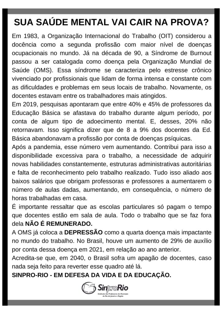 O Sinpro-Rio realizou, no dia 24 de outubro, evento sobre o Dia Internacional da Saúde Mental. A Cinelândia foi o palco do acontecimento, marcado oficialmente para 10 de outubro, mas que, devido a condições meteorológicas, só pode ser promovido neste dia 24. O Sindicato centrou suas falas no adoecimento mental de professoras e professores, dado às péssimas condições de trabalho que lhes são impostas.