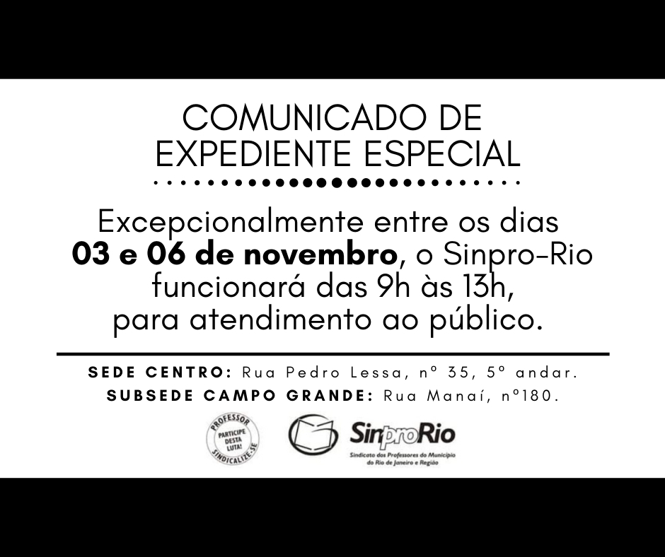 Atualizado dia 03/11 – o expediente especial foi suspenso em virtude de 4 casos suspeitos de coronavirus entre os funcionários do sindicato. Contamos com a compreensão de todos/as.