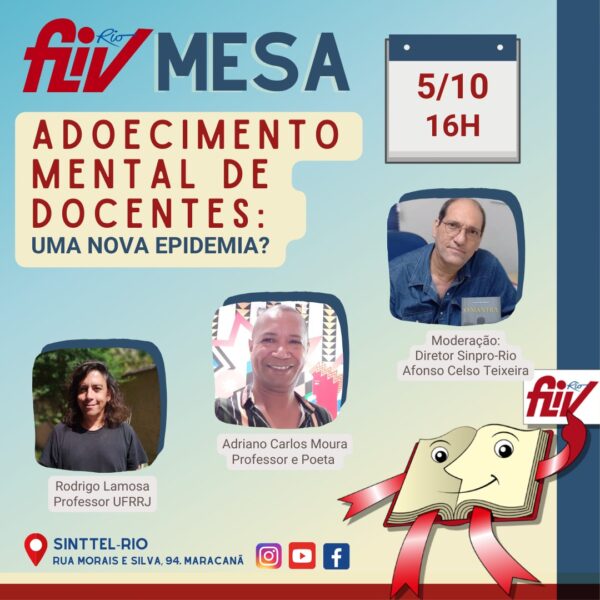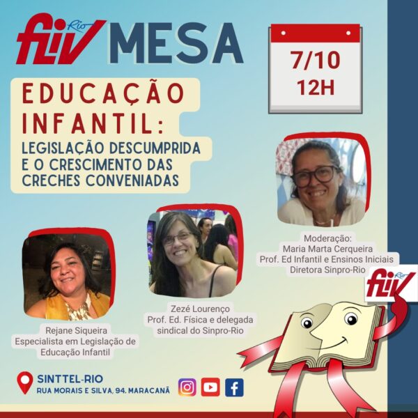 O Sinpro-Rio participará de debates durante o evento. No 05/10, às 16 horas, o diretor Afonso Celso Teixeira participará da mesa “Doença Mental de Docentes: uma Nova epidemia?”, ao lado de Adriano Carlos Moura, professor e poeta, e de Rodrigo Lamosa, professor da UFRJ. Já no dia 07 de outubro, será a vez das diretoras Maria Marta Cerqueira e Zezé Lourenço participarem da mesa Educação Infantil: Legislação Descumprida e o Crescimento das Creches Conveniadas, ao lado de Rejane Siqueira, especialista em Legislação de Educação Infantil.