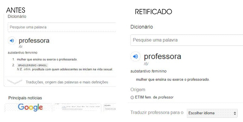 Ao buscar o significado da palavra “professora”, o dicionário apresentava, além da definição usual, “mulher que ensina ou exerce o professorado”, o Google também publicava que, em razão do “brasileirismo”, professora era também definida como “prostituta com quem adolescentes se iniciam na vida sexual.”