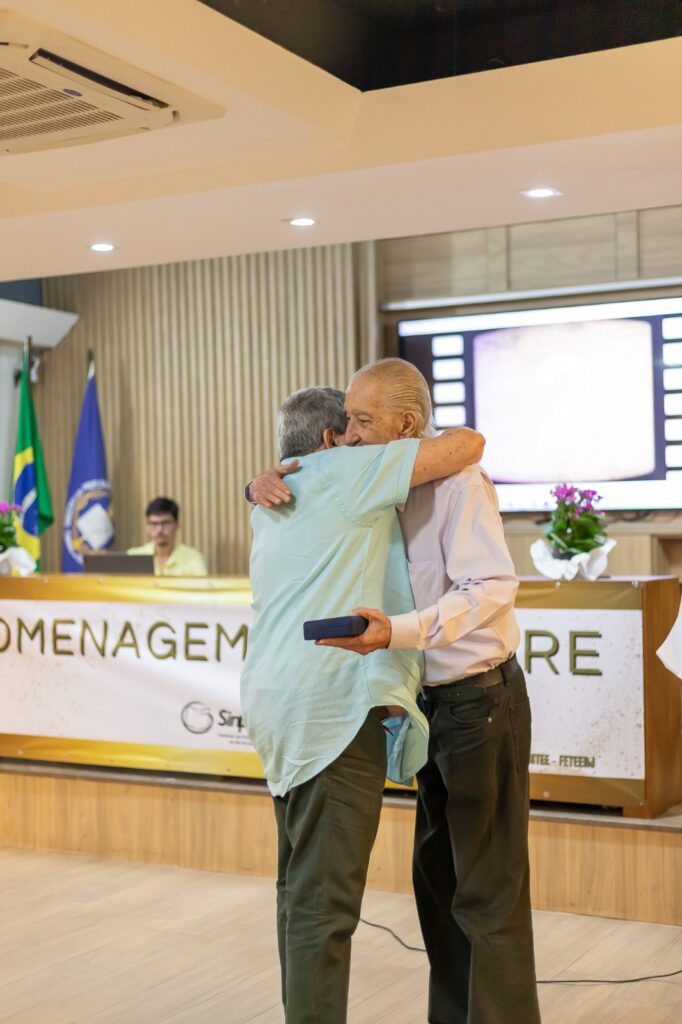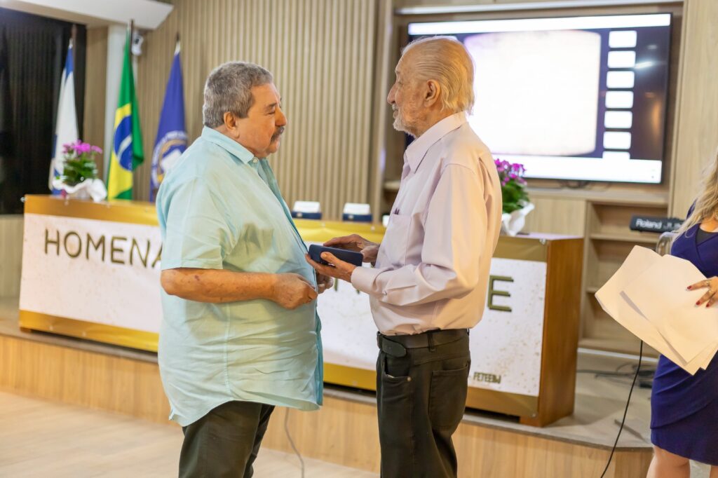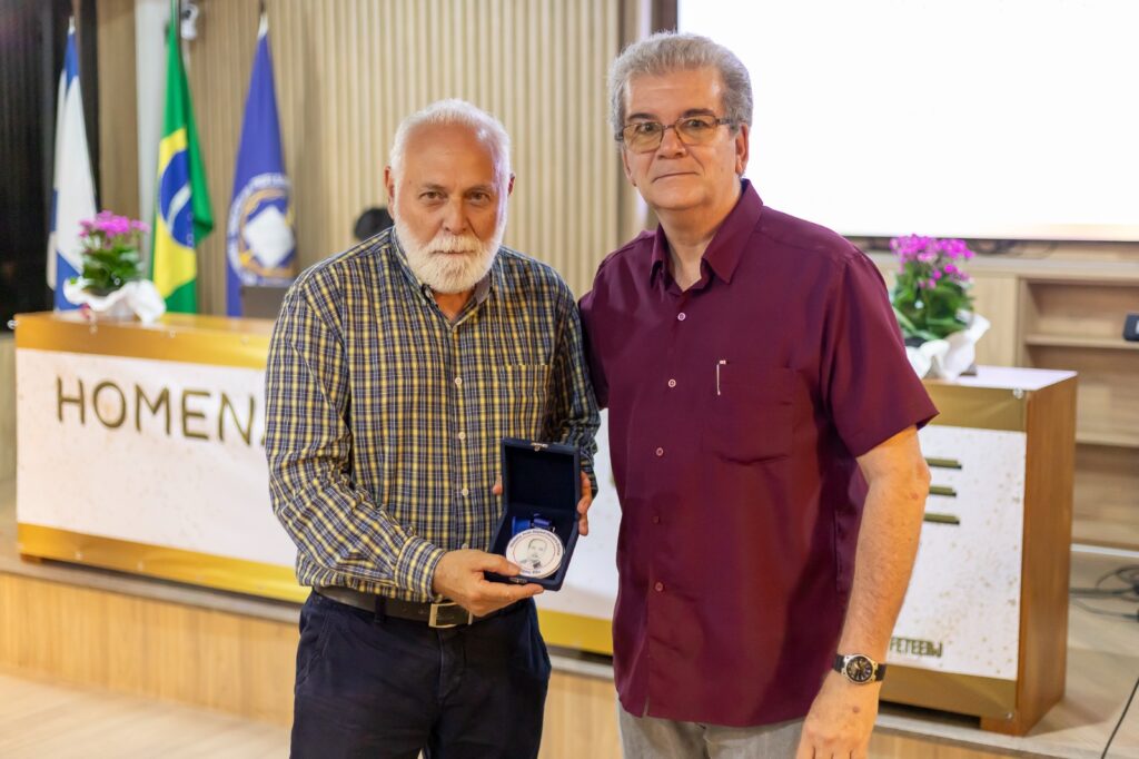 Recebendo a honraria das mãos do diretor João Jorge Armênio, o professor Cezar Castro afirmou: “não acredito no trabalho individual, nossa profissão é de trabalho coletivo. Dedico esta medalha a todos nós, coletivamente”.