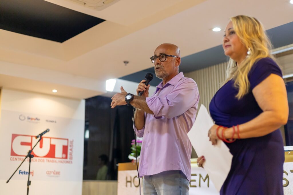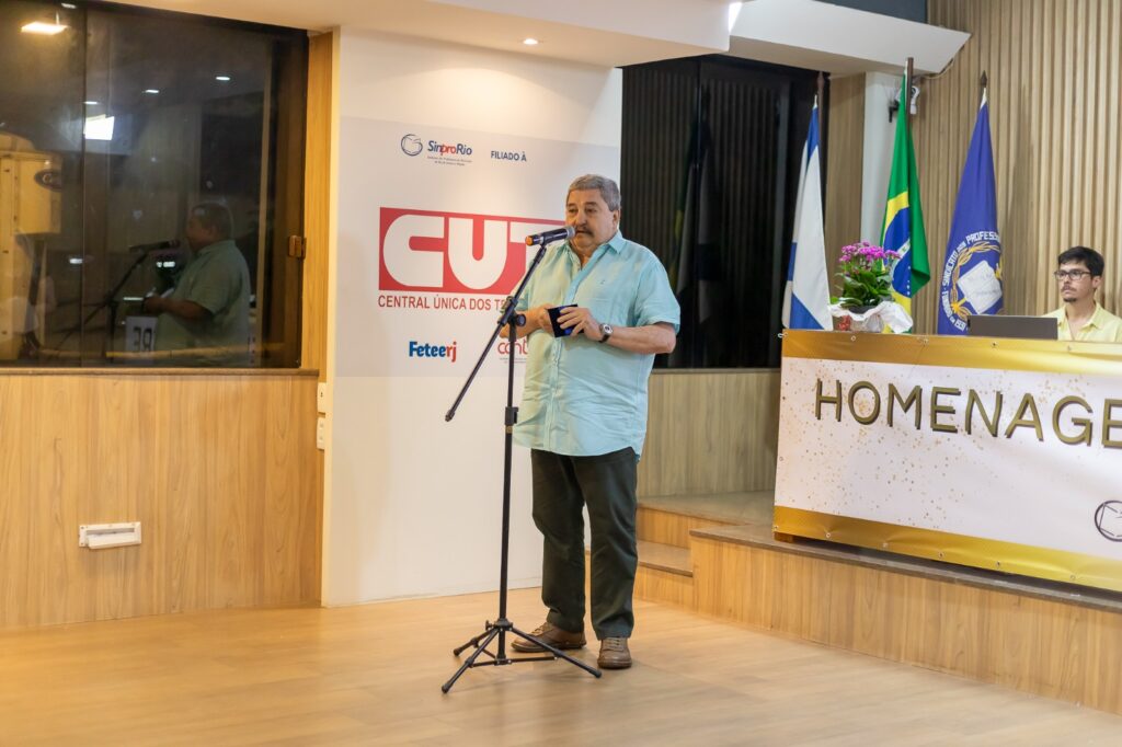 Na abertura, o presidente em exercício, Marcelo Pereira, ressaltou que a homenagem se revestia numa cerimônia histórica que culminava com um conjunto de atividades do Mês dos Mestres. “O Sinpro-Rio é um local de protagonismo no qual é dado voz ao trabalhador. Prestes a completar 100 anos de luta e resistência, o Sinpro-Rio se pautou pela atuação contra a ditadura e pelo processo de redemocratização do país, se destacando na greve da Educação Superior, na qual conquistamos a considerada melhor Cponvenção Coletiva de Trabalho do Brasil”. Marcelo Pereira lembrou ainda de um feito recente da categoria de professores e professoras do Sinpro-Rio, a greve pela vida durante a pandemia em 2020.