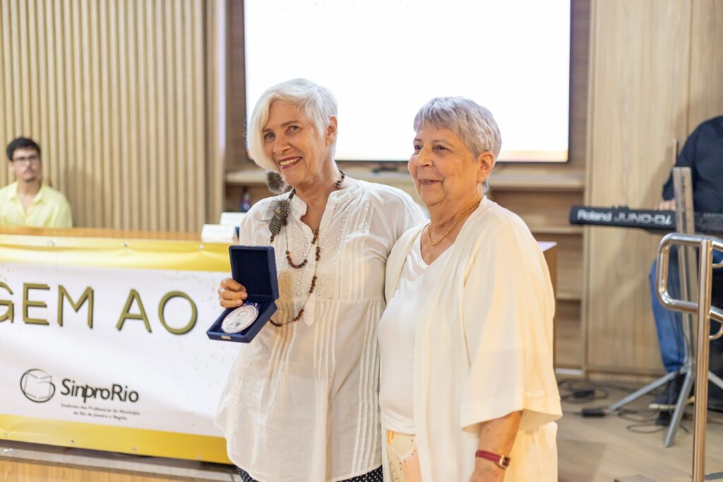 A professora Lúcia Velloso, que recebeu da medalha das mãos da professora Leila Azevedo, fez um breve relato da luta contra ditadura militar e pela redemocratização quando esteve como diretora o Sinpro-Rio, de 1978 a 1983, pontuando que conseguiram tirar antigos “pelegos” da diretoria, vencendo as eleições. Ela, que passou a dar aula depois de sair da prisão política na década de 70.