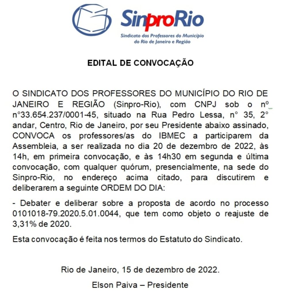 IBMEC: assembleia presencial dia 20/12, às 14h.  Esperamos vocês!