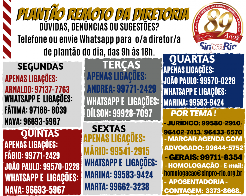 DÚVIDAS? Procure o Plantão da Diretoria do Sinpro-Rio! Contatos abaixo: