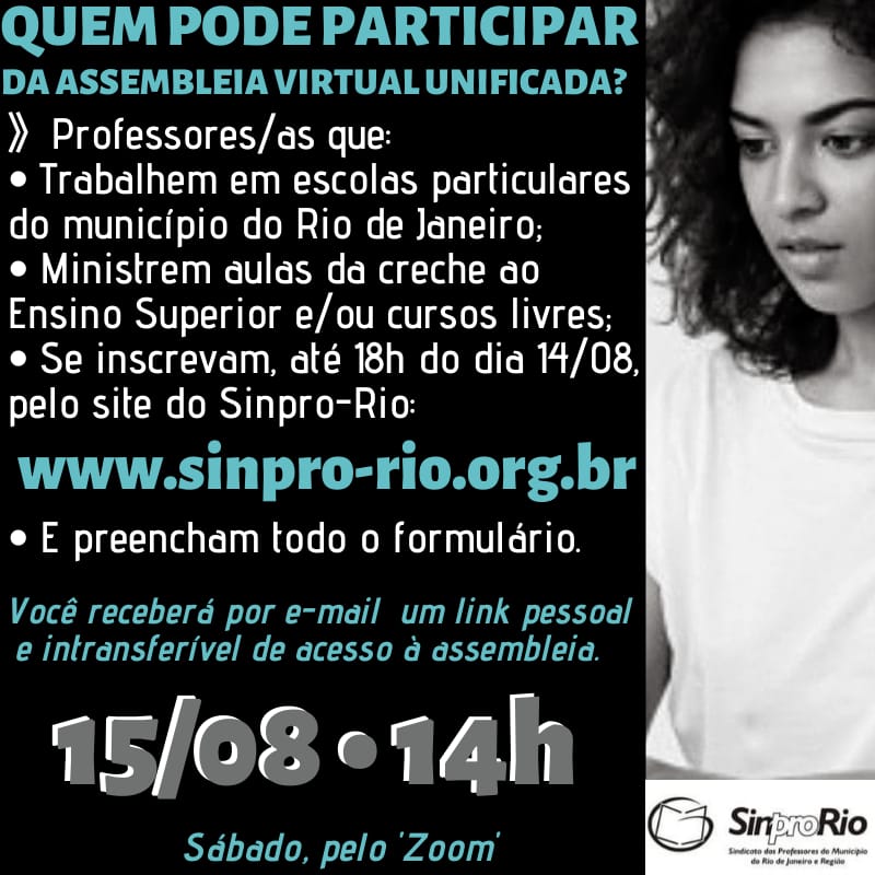 Estão abertas as inscrições para a Assembleia Unificada do dia 15/08/2020. Veja na imagem abaixo quem pode participar da assembleia: