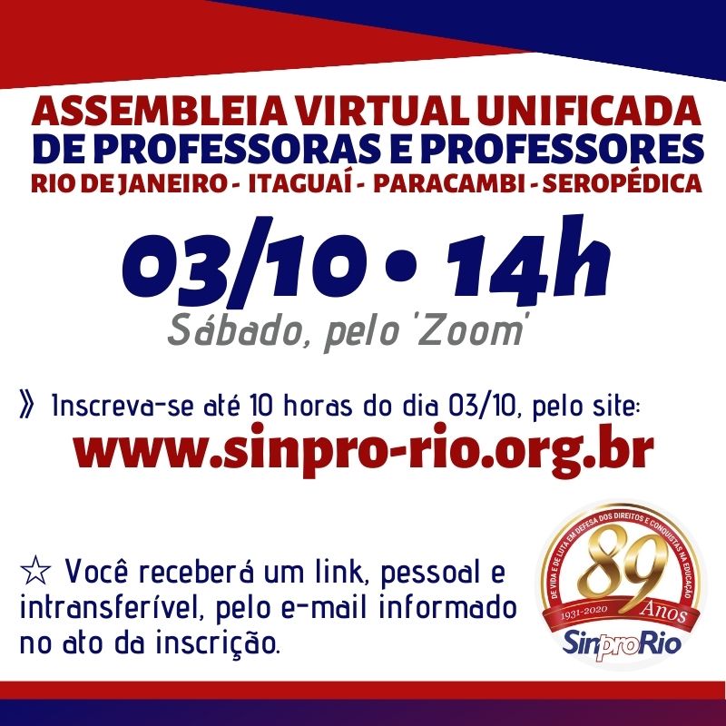Nossa assembleia será no próximo sábado, dia 03 de outubro, às 14 horas, via ZOOM. As inscrições ocorrem pelo site do SINPRO-RIO (INSCREVA-SE CLICANDO AQUI). A luta continua e estamos juntos na preservação da vida acima do lucro.