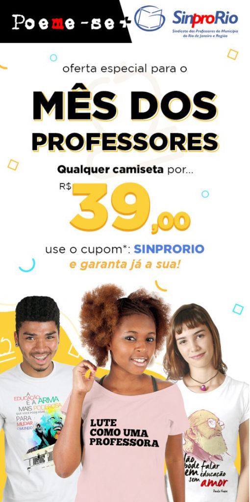 Atenção, filiados/as ao Sinpro-Rio! No mês do professor e da professora, o site Poeme-se está cobrando R$39,00 nas camisetas para os/as docentes que utilizarem o cupom do Sindicato!