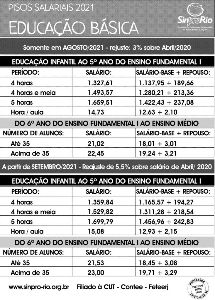 Tabela de PISOS SALARIAIS 2021, após assinatura, em 02/08/2021, da CCT 2021 da Ed. Básica (leia AQUI!).