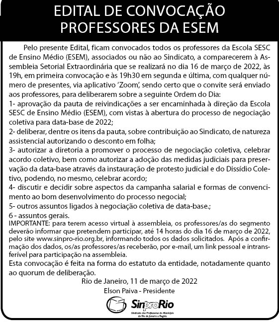 Veja a pauta no edital publicado neste dia 11 de março, na página 5 do jornal Monitor Mercantil (ou leia na imagem abaixo) e INSCREVA-SE PARA A ASSEMBLEIA AQUI!