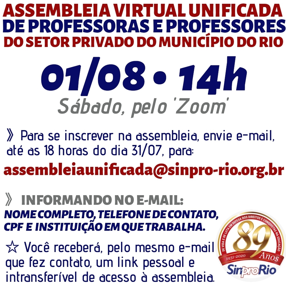 Nossa próxima assembleia unificada dos Professores e Professoras da Educação Básica e Superior será dia 1° de agosto, onde decidiremos os rumos do movimento de defesa da saúde e da vida.