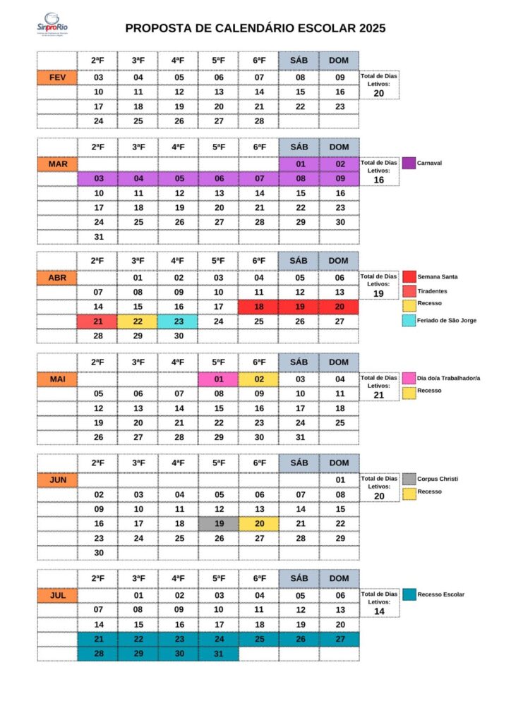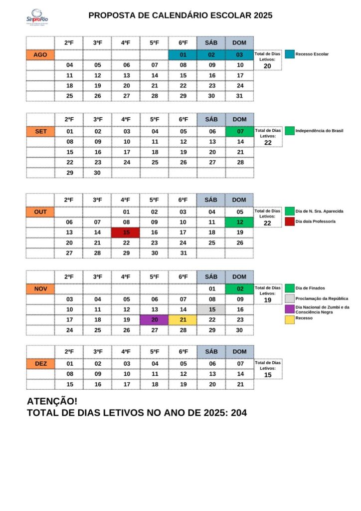 Abaixo você confere a sugestão de calendário escolar para 2025, feito pelo Sinpro-Rio para as escolas da Educação Básica e Instituições de Ensino Superior, privadas, do município do Rio de Janeiro.