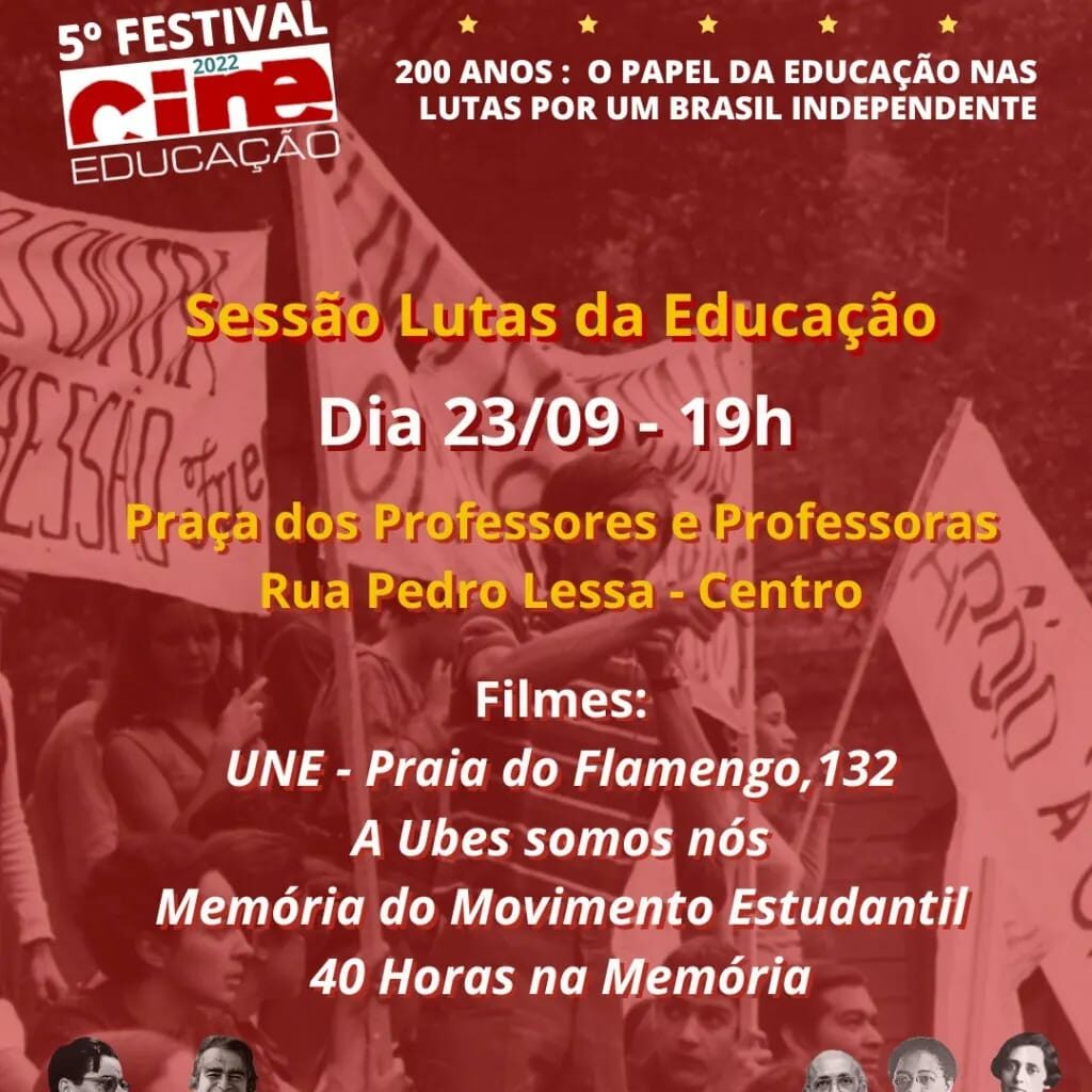 Terceiro dia do 5° Festival Cine Educação. Sessão ao ar livre na Praça das Professoras e Professores e festa com DJ a seguir. Em caso de chuva, a sessão ocorrerá no Espaço Cultural Paulo Freire, em frente à Praça. Apareçam