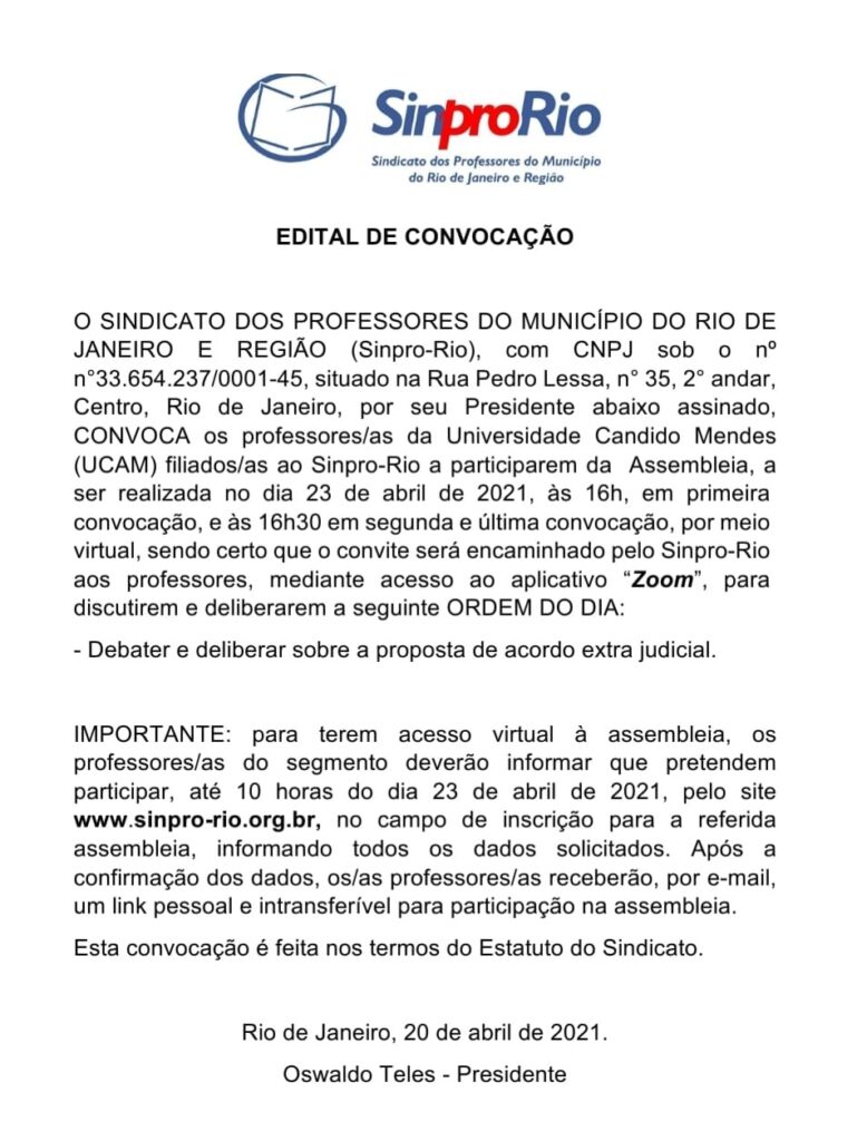Professor/a da UCAM filiado/a ao Sinpro-Rio, sua participação nesta assembleia é fundamental. Esperamos vocês!